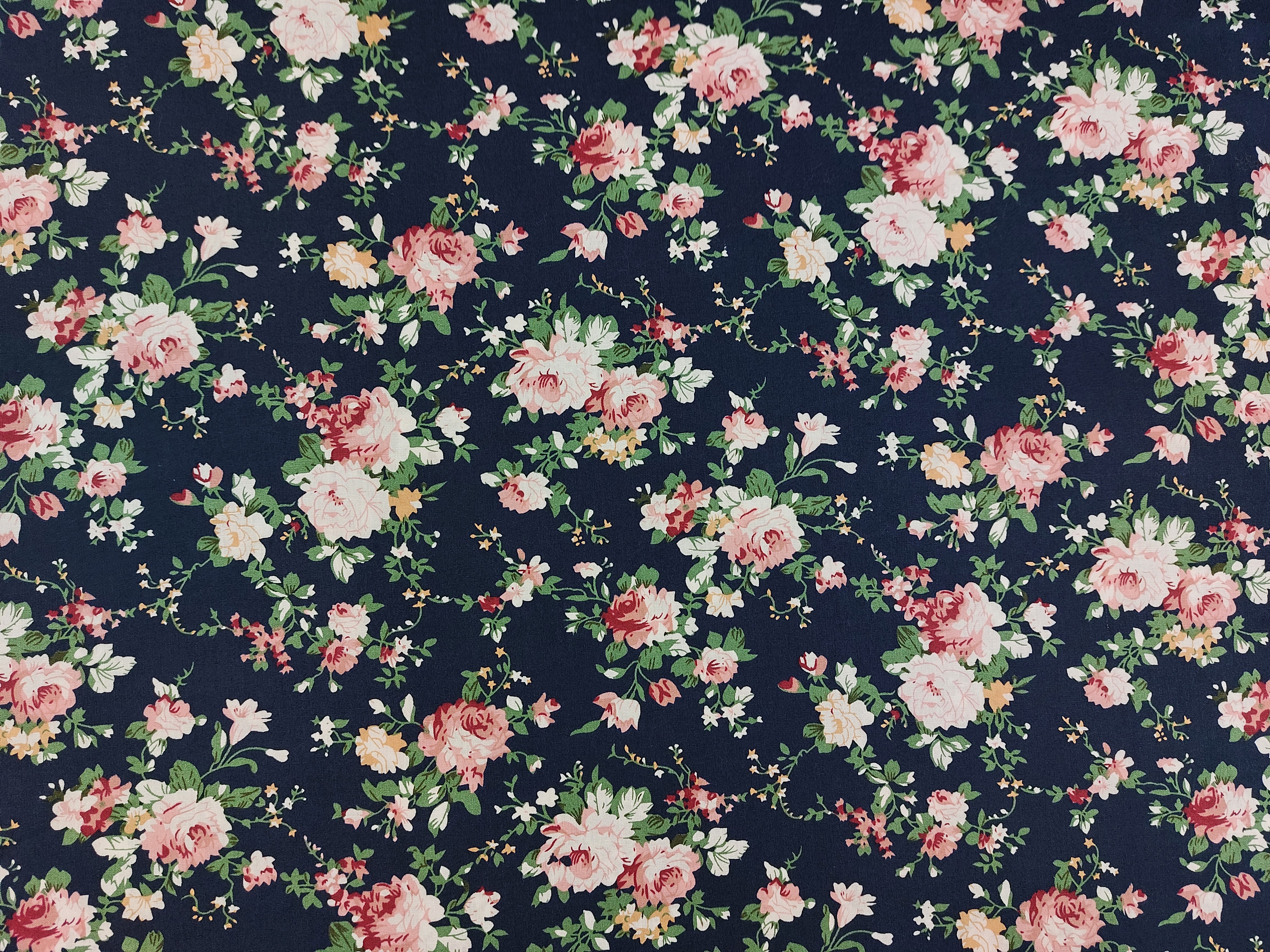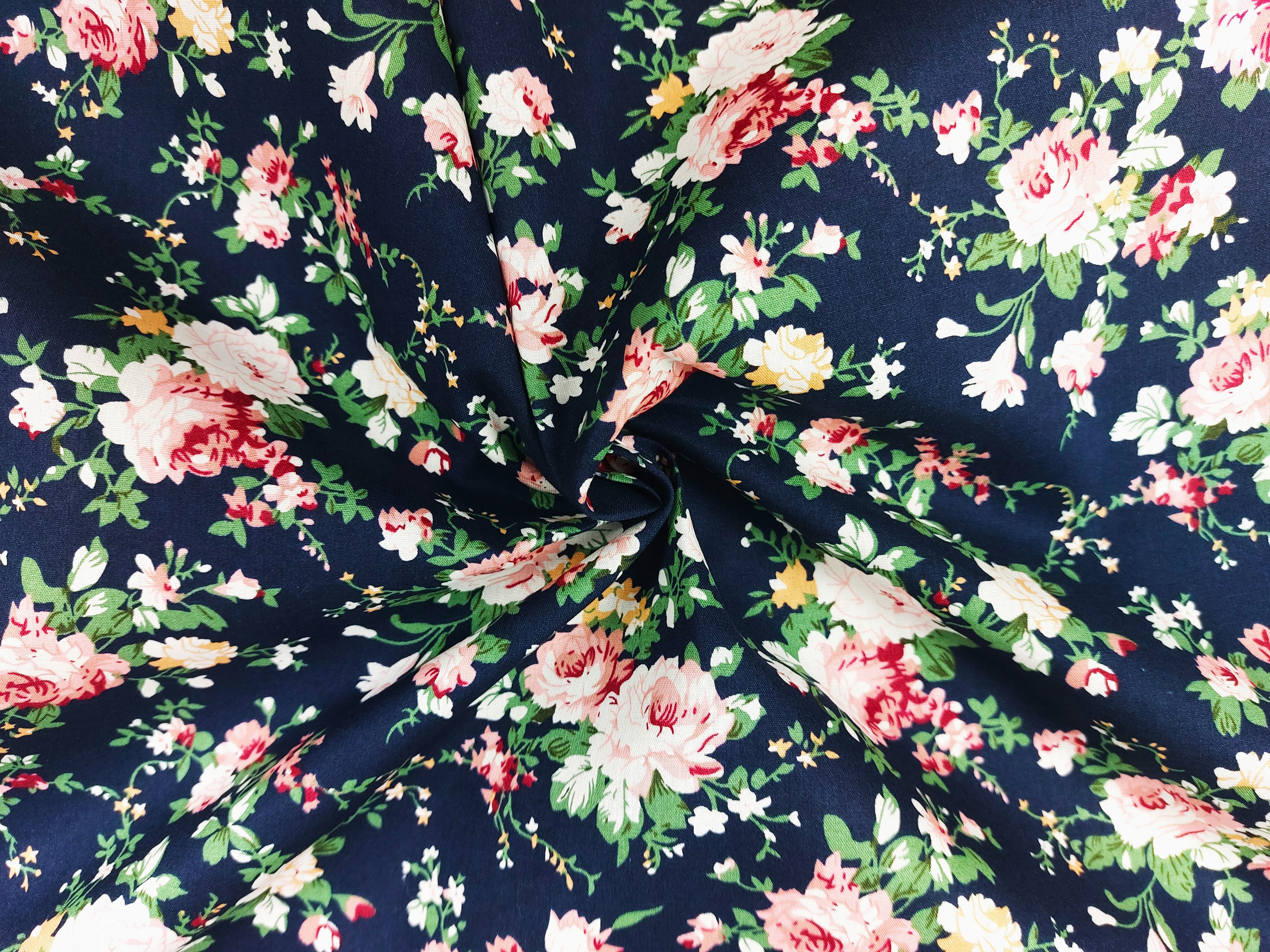 Webware aus Baumwolle , Rosenmuster , Grundfarbe dunkelblau