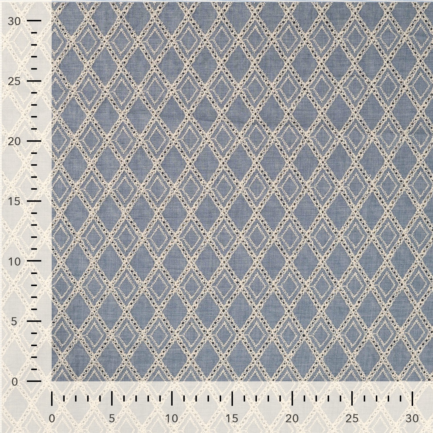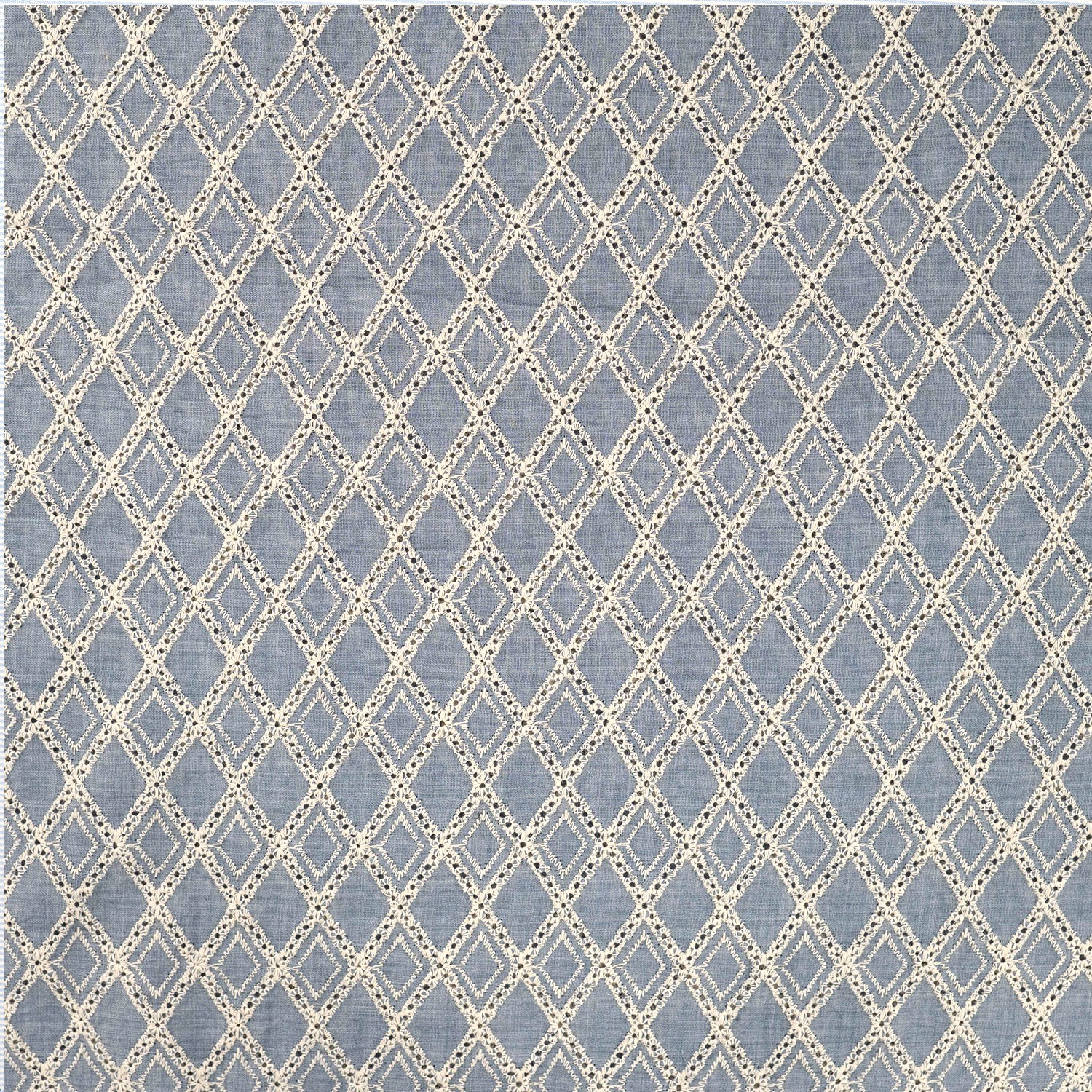 Produktinformationen "Baumwollwebstoff, dusty bleu, graphische Stickerei in natur "