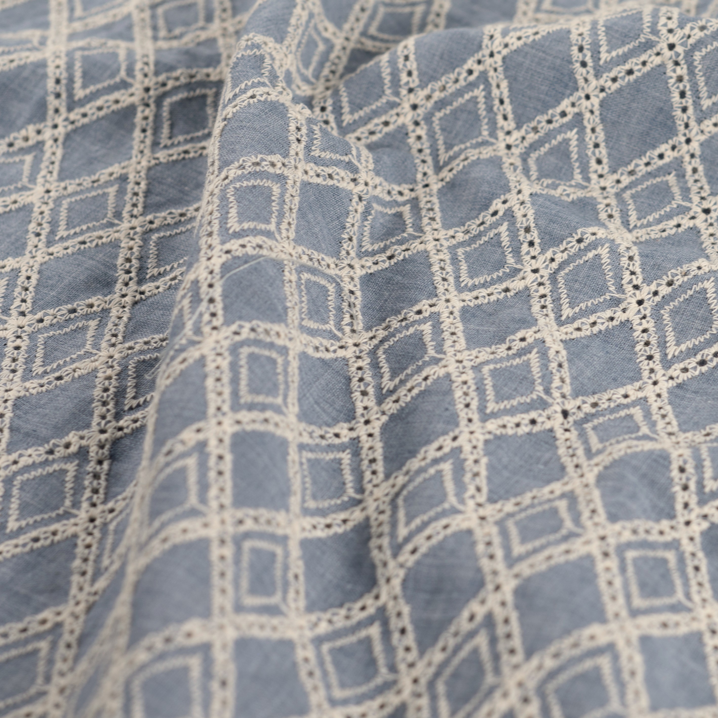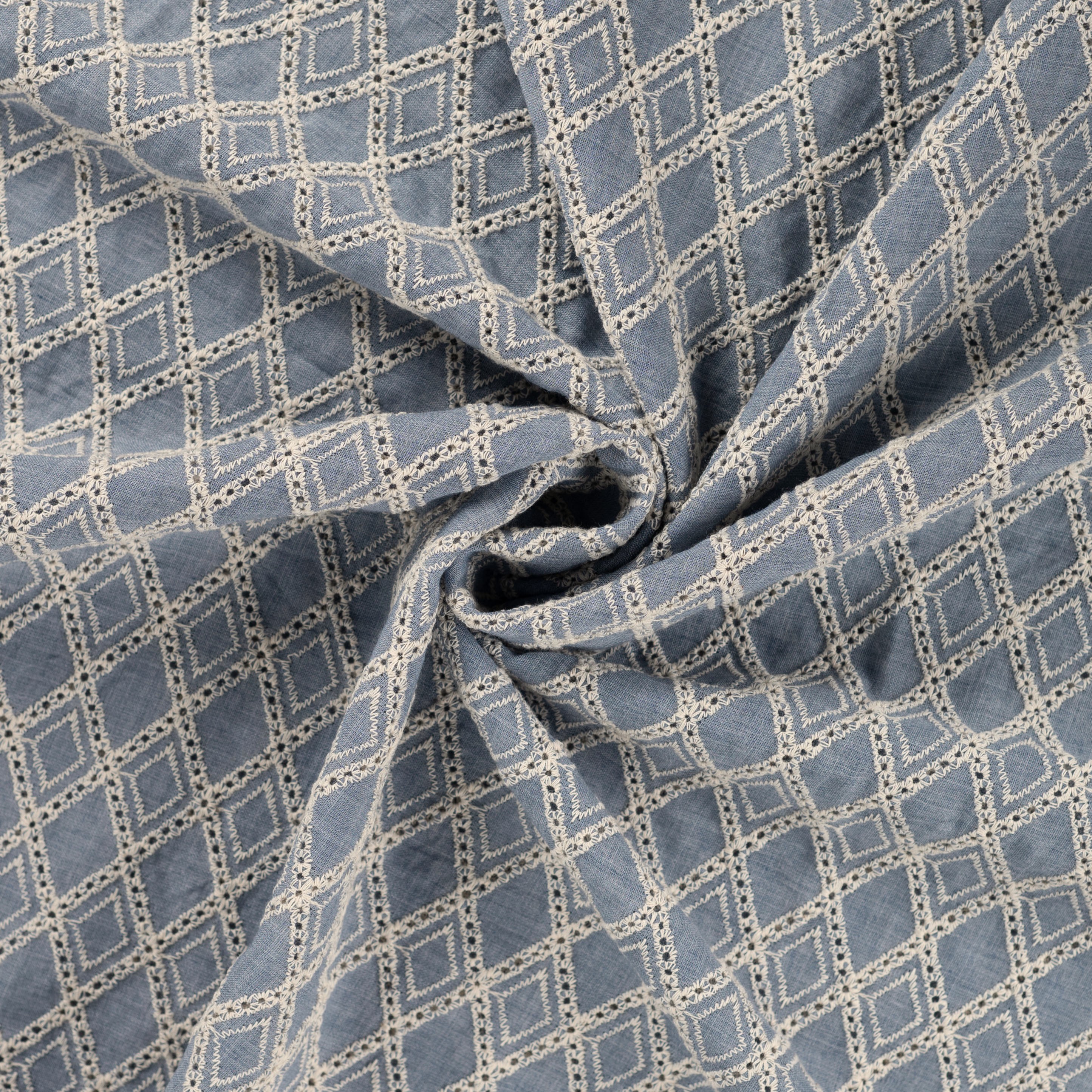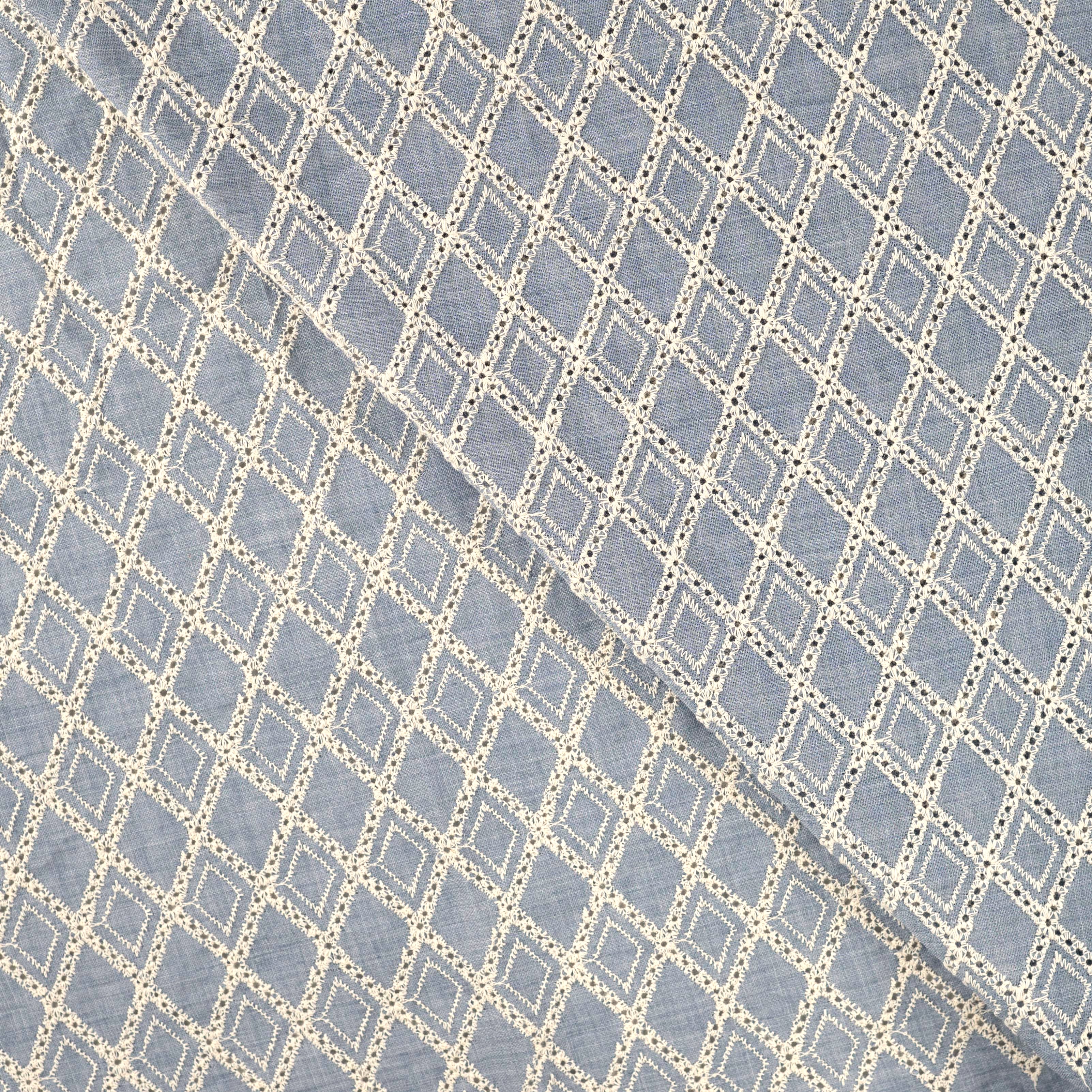 Baumwollwebstoff, dusty bleu, graphische Stickerei in natur
