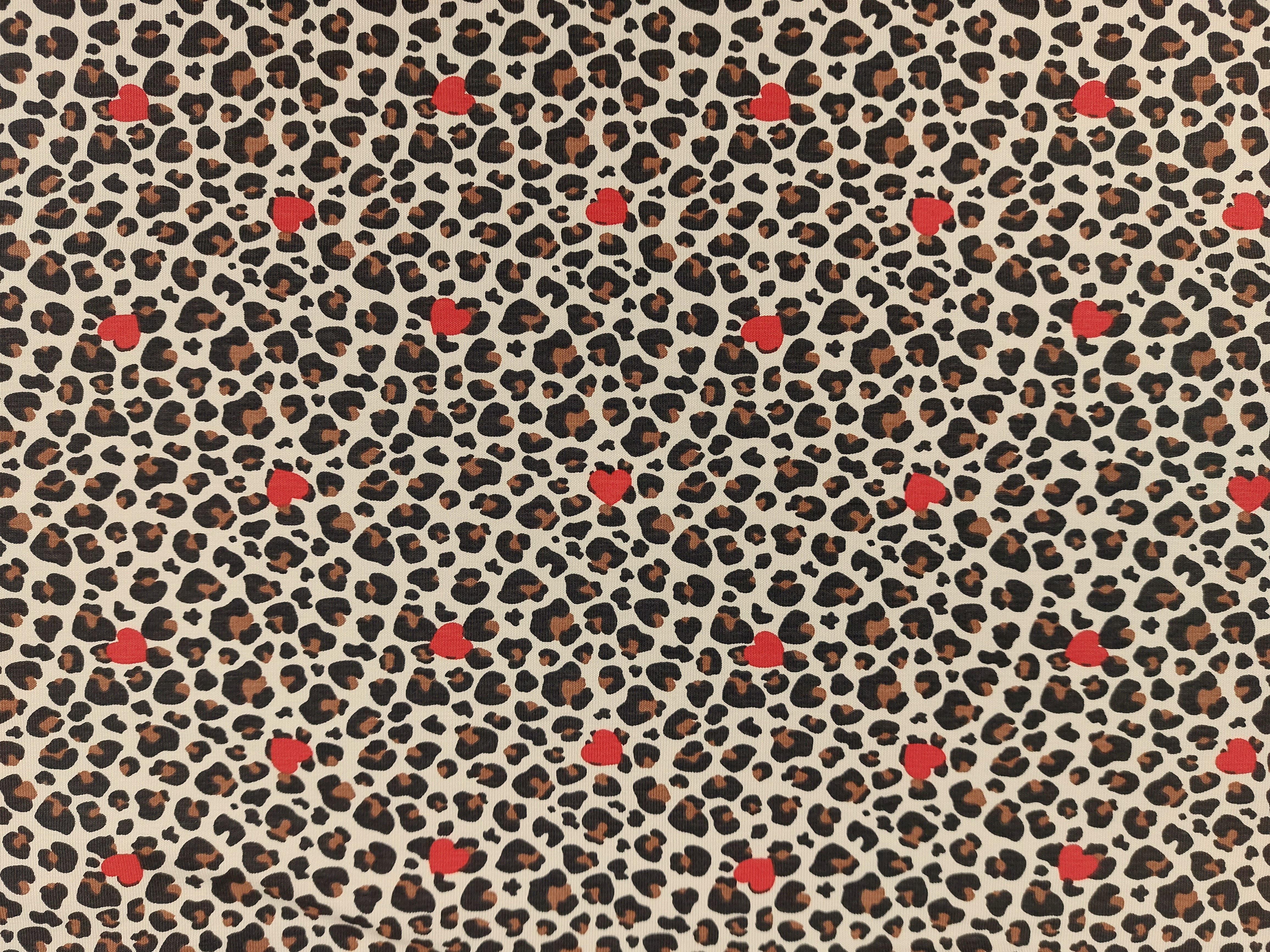 bedruckter Jersey, weich fallend, elastisch, sandfarbener Grundton mit dunkelbraunem und schwarzem Animalmuster. Leuchtend rote Herzen lockern den Druck auf
