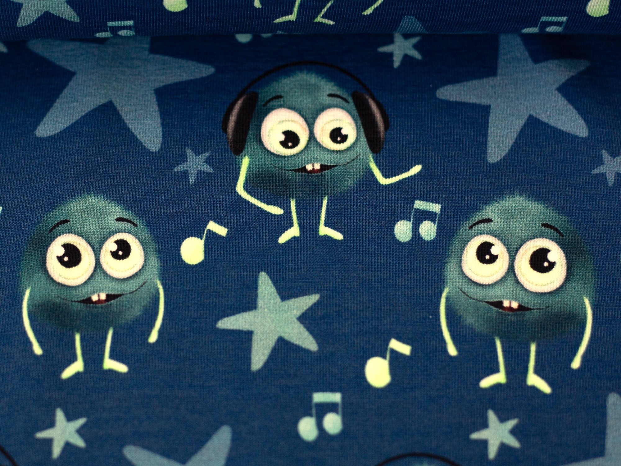 bedruckter Jersey, weich fallend, elastisch, kleine Monster mit Kopfhörern