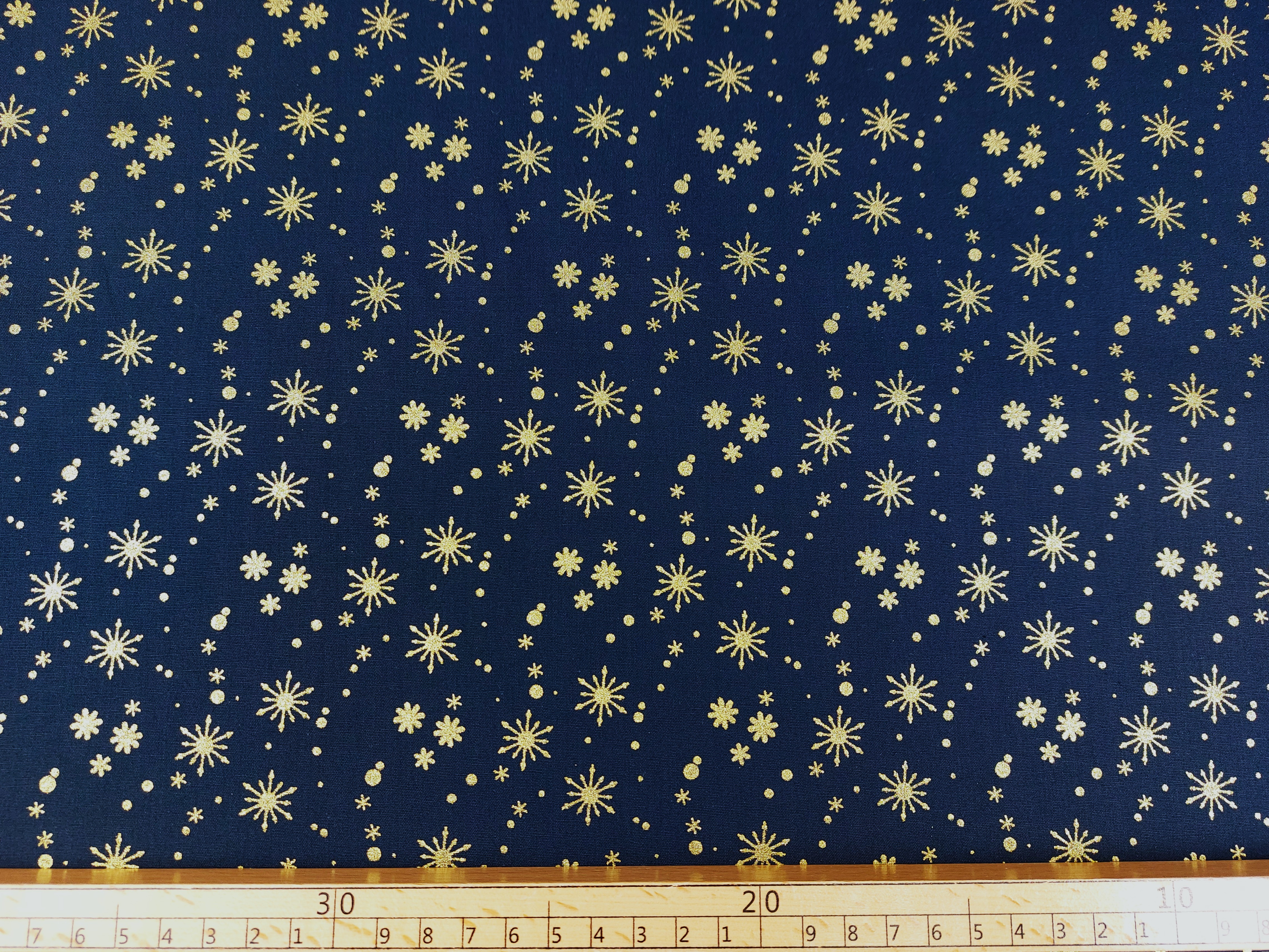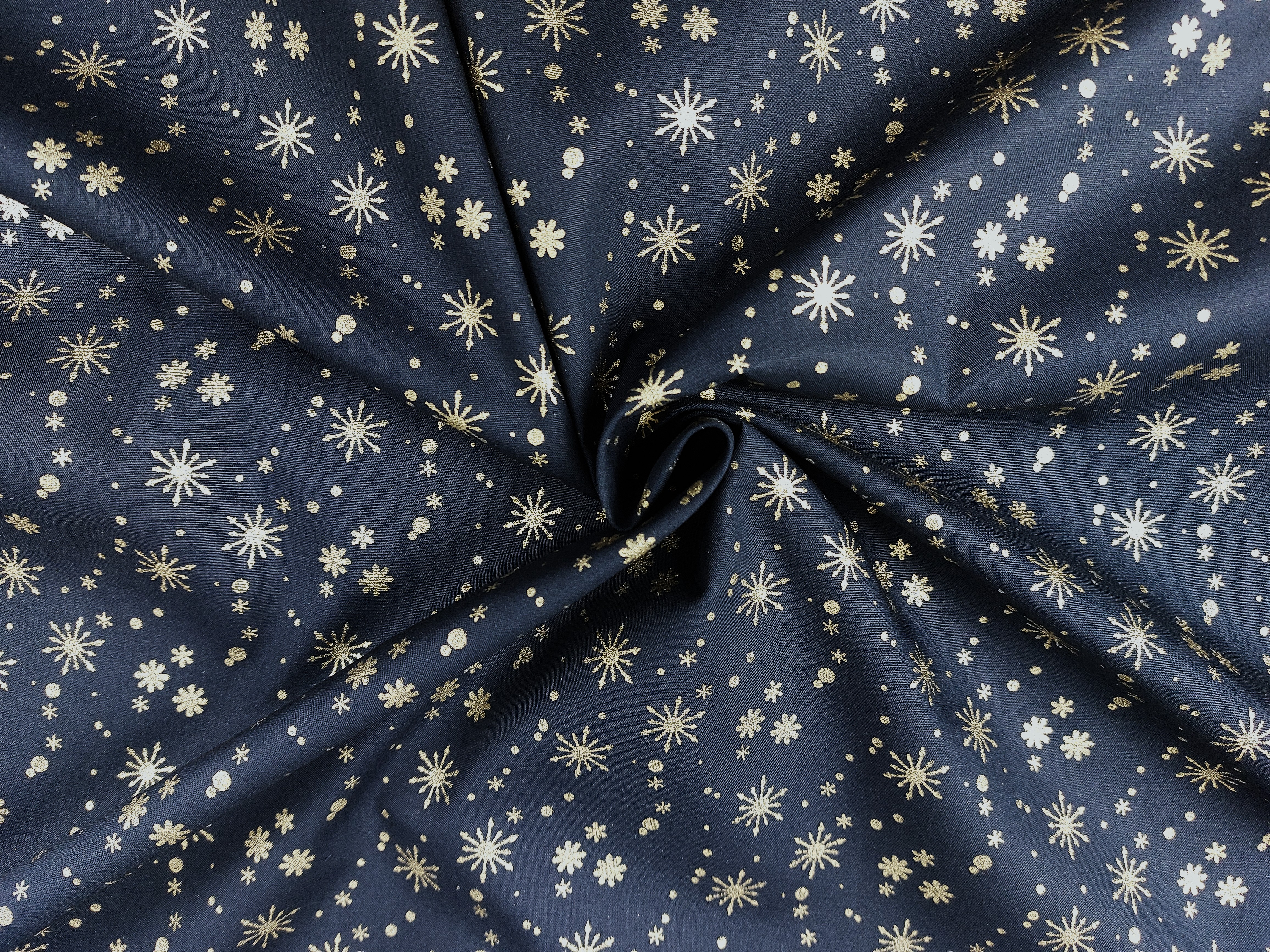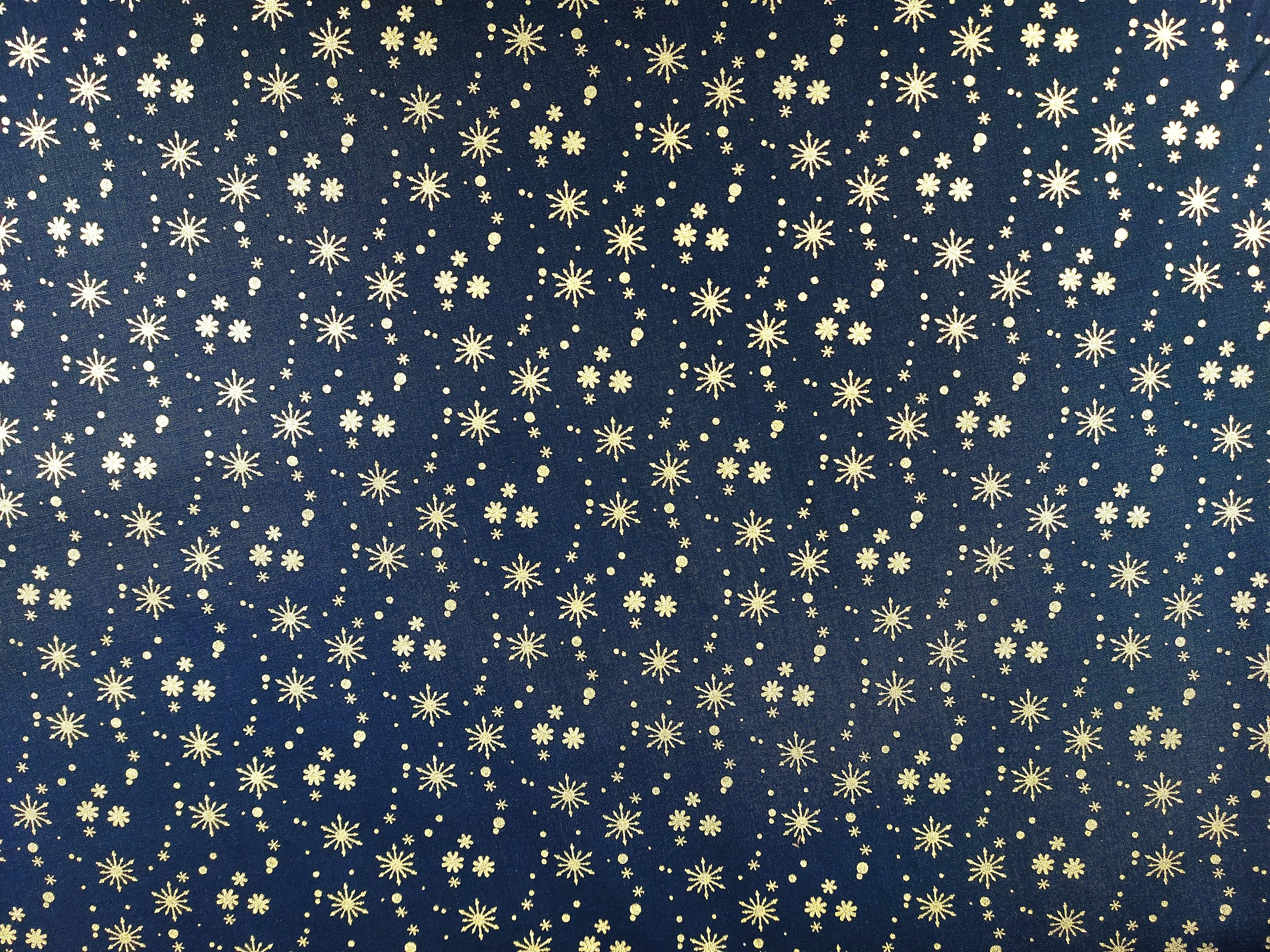 Webware, bedruckt, aus Baumwolle , weihnachtlicher Stoff in marine mit Goldfarbenen Glanzakzenten in Schneeflockenform